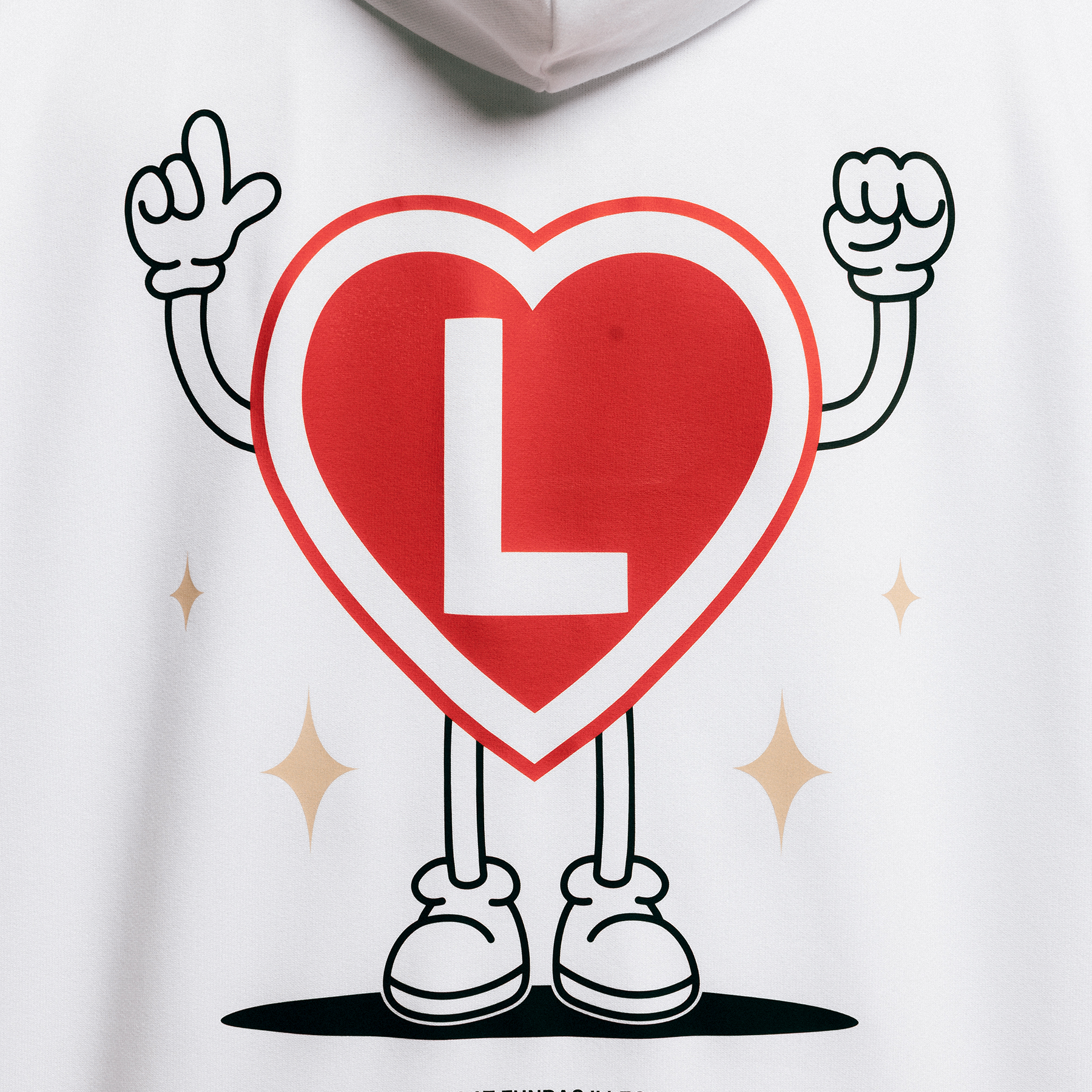Bluzę zdobi subtelna naszywka w kształcie dłoni układającej się w charakterystyczny znak „eLki”, bliski każdemu legioniście. Na plecach umieszczono dużą, okolicznościową grafikę – serce z literą „L” w środku, nawiązującą do logo Fundacji. To symbol pokazujący, że łączy nas jedno serce, a w nim widnieje „L” jak Legia.