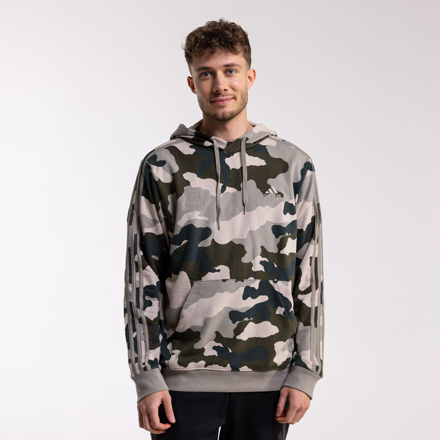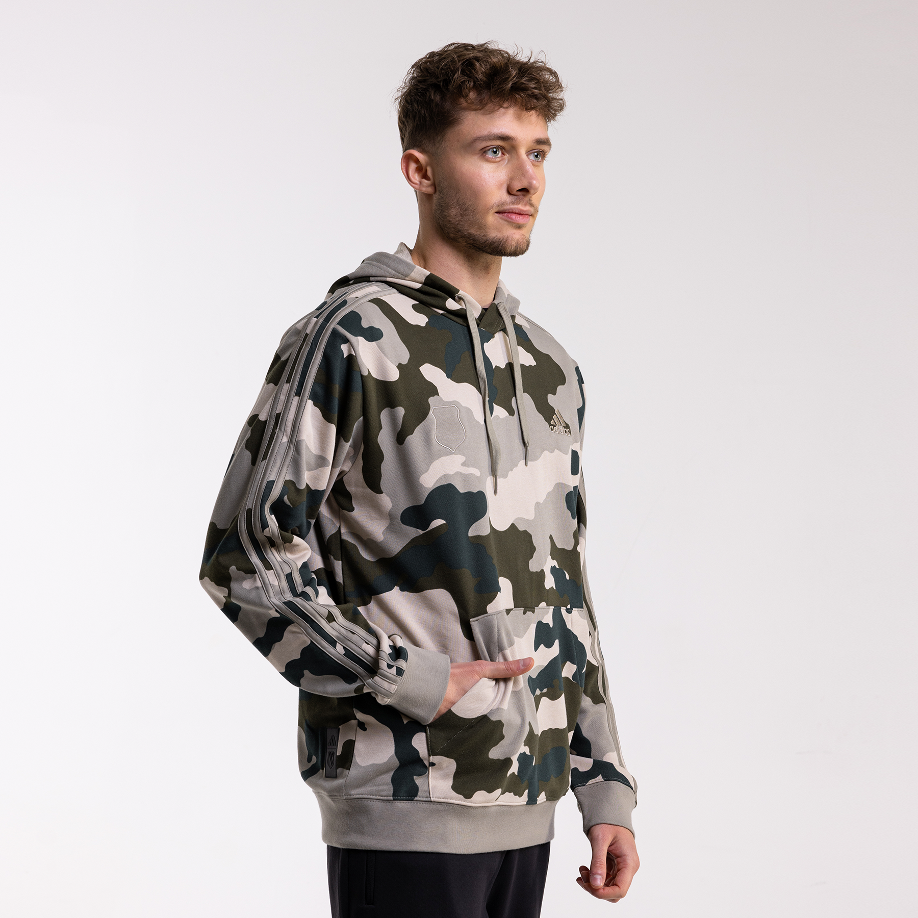 Jeśli lubisz podkreślać swoje przywiązanie do drużyny, ale cenisz sobie minimalizm, ta bluza jest dla Ciebie. Na piersi znajdziesz obrys herbu Legii Warszawa, który wtapia się w kamuflażowy wzór, tworząc stylowy, ale nienachalny akcent. Klasyczne 3 paski adidas na rękawach dopełniają całości, dodając sportowego charakteru.