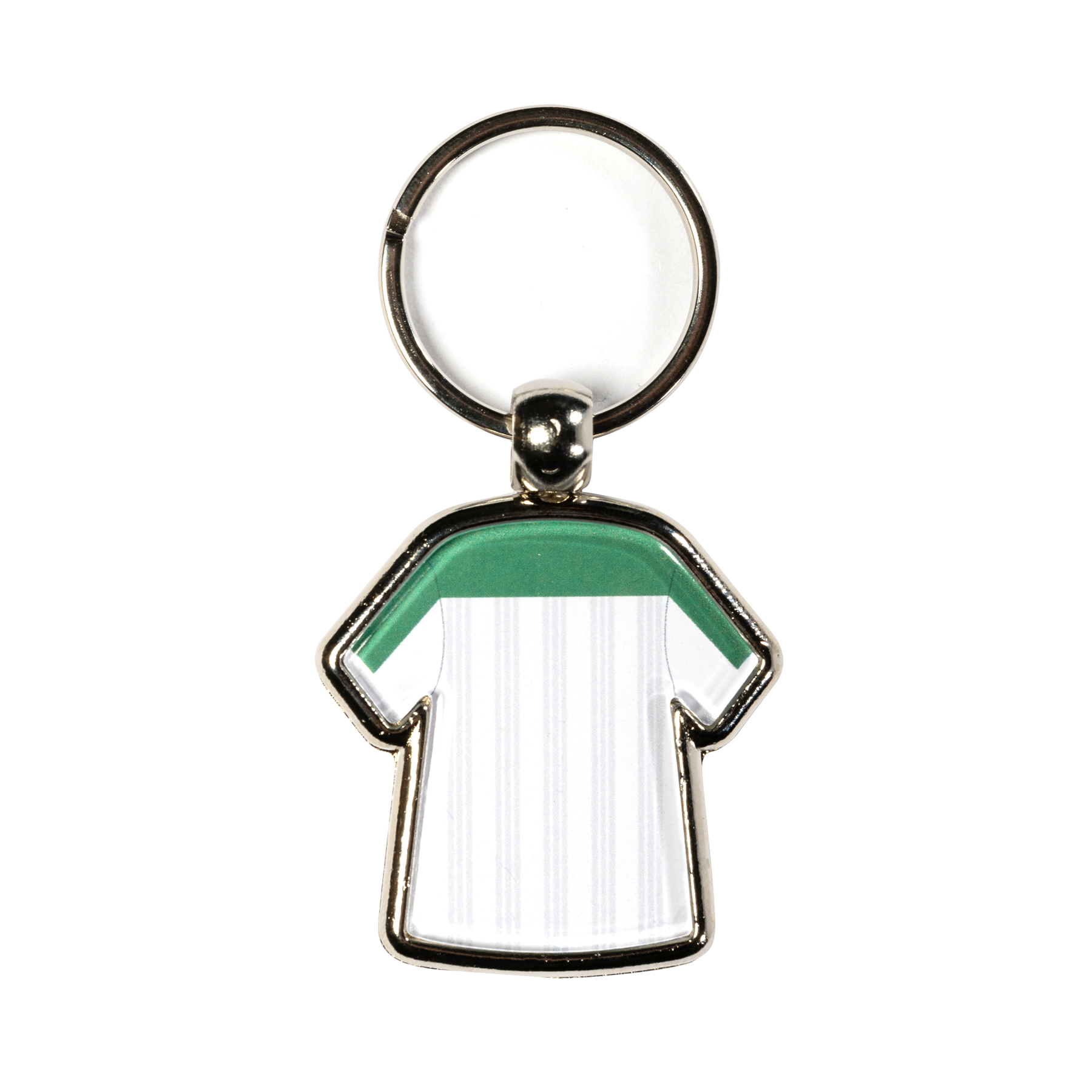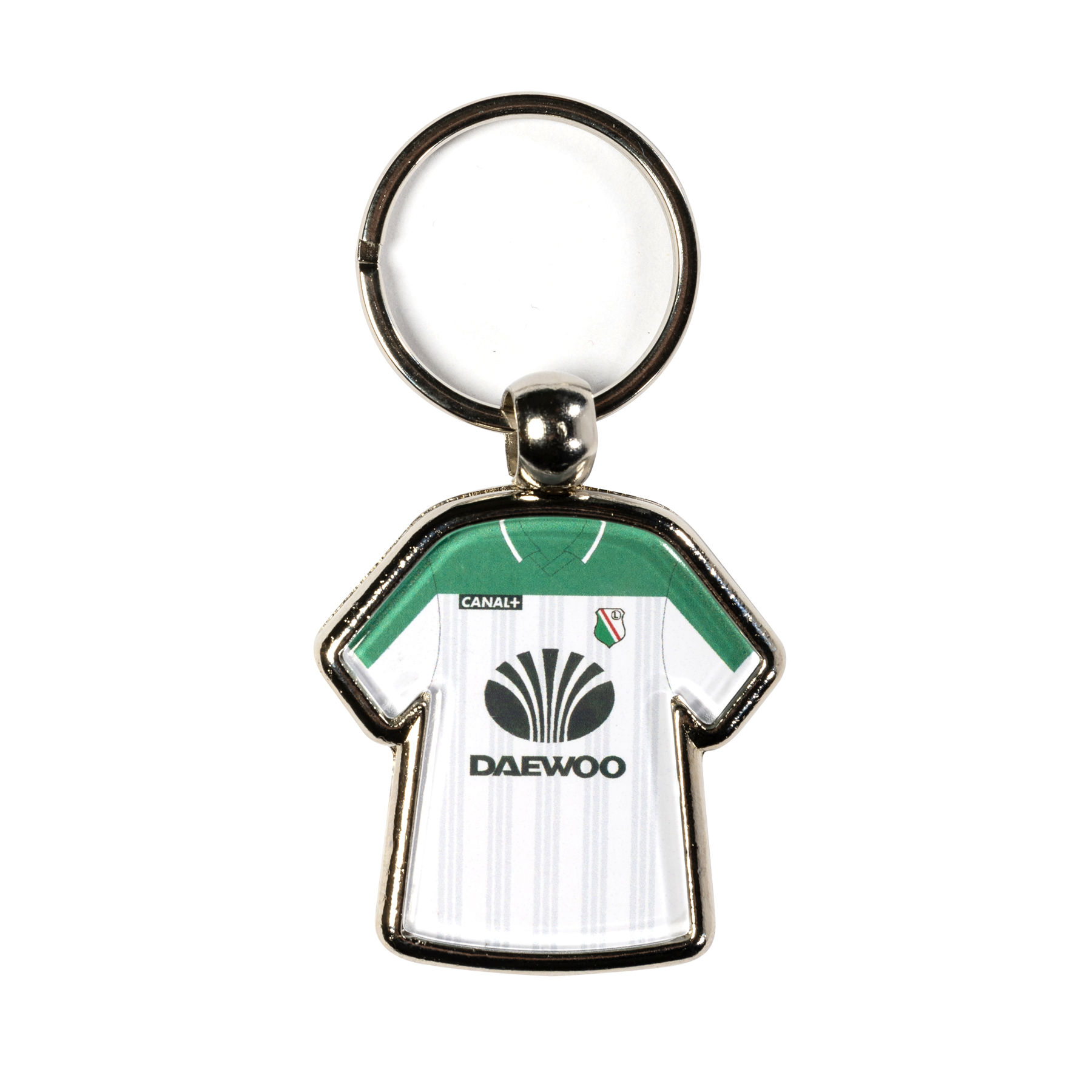 Ten metalowy brelok w kształcie koszulki to wyjątkowy gadżet dla każdego kibica Legii Warszawa. Dominująca czerwień, uzupełniona białymi i zielonymi akcentami, odtwarza detale kultowego stroju z sezonu 2000/2001. Centralnie umieszczone logo sponsora Daewoo oraz naszywka Canal+ przypominają o ważnym okresie w historii klubu. Herb Legii Warszawa na froncie dopełnia całość, podkreślając tradycję i dumę drużyny.