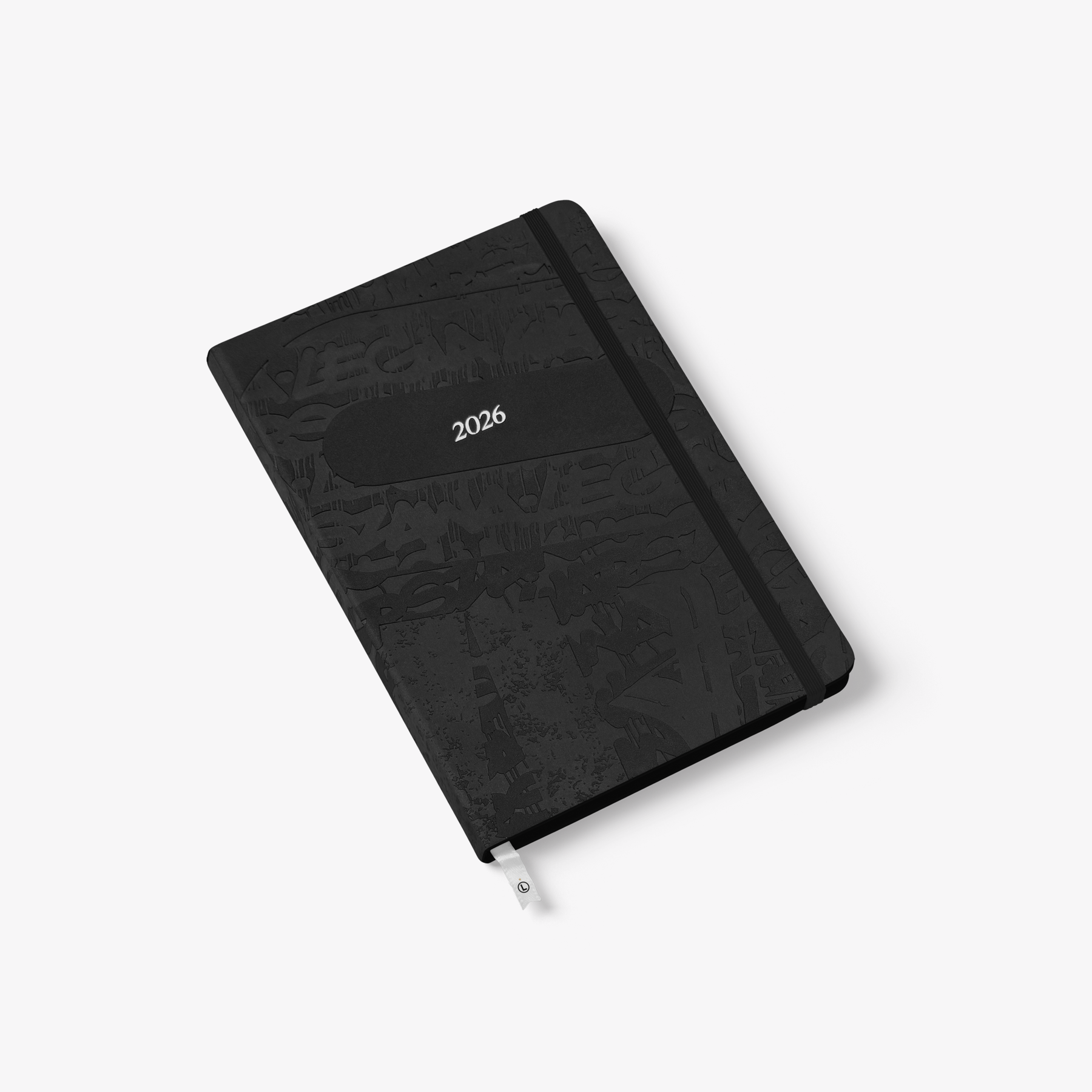 Wygląd i okładka: Kalendarz wyróżnia się przede wszystkim materiałem – został pokryty przyjemnym w dotyku, czarnym welurem. Miękka tkanina nadaje mu głębi i ekskluzywnego charakteru. Na welurowej powierzchni wytłoczono trójwymiarowy wzór inspirowany graffiti i street artem, co tworzy ciekawy kontrast między eleganckim materiałem a drapieżną grafiką.