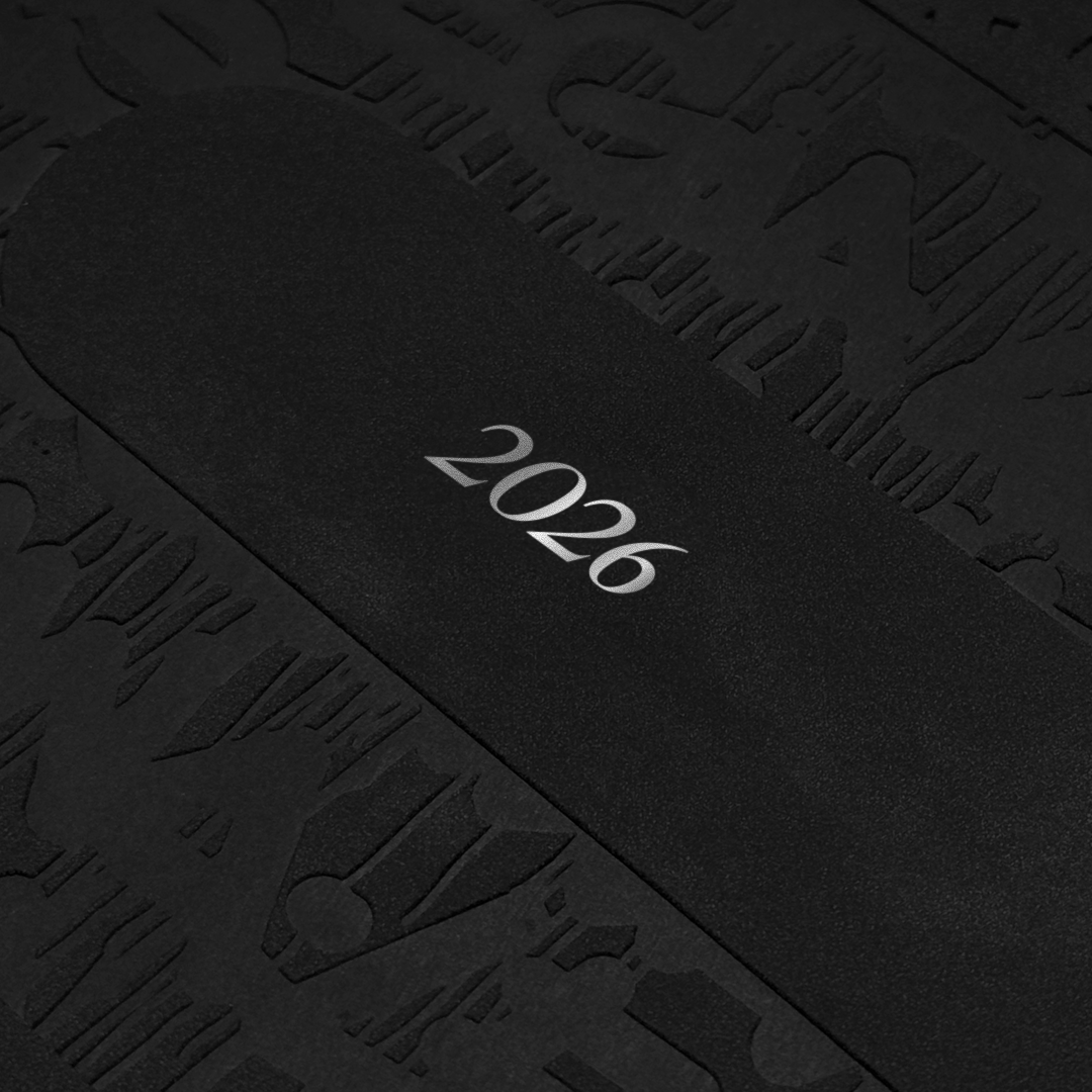 Na środku, na gładkim polu, umieszczono srebrny rok 2026, który wyraźnie odcina się od matowego, welurowego tła.
