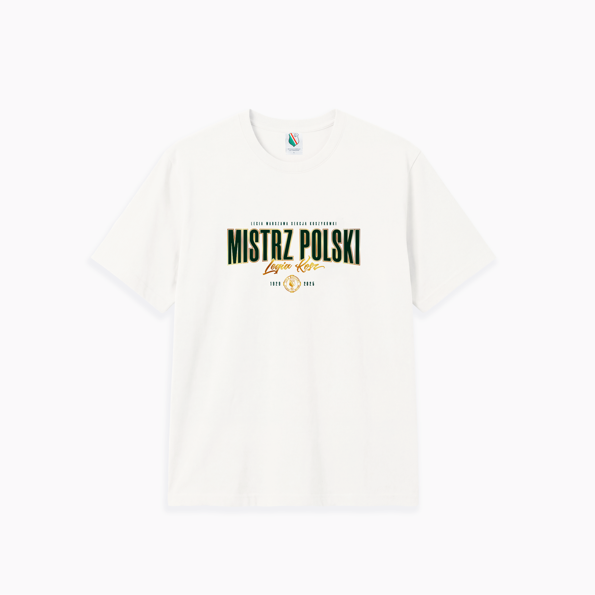 To koszulka, która dba o każdy szczegół. Na samej górze znajdziesz precyzyjny napis „LEGIA WARSZAWA SEKCJA KOSZYKÓWKI” – jasny sygnał, kogo reprezentujesz. Poniżej dominuje duży, zielony napis „MISTRZ POLSKI” ze złotym obramowaniem, przełamany złotym, odręcznym hasłem „Legia Kosz”. Całość zamyka herb sekcji i data 1929. Nadruki łączą matową zieleń z metalizowanym złotem, co daje niesamowity efekt wizualny w słońcu.