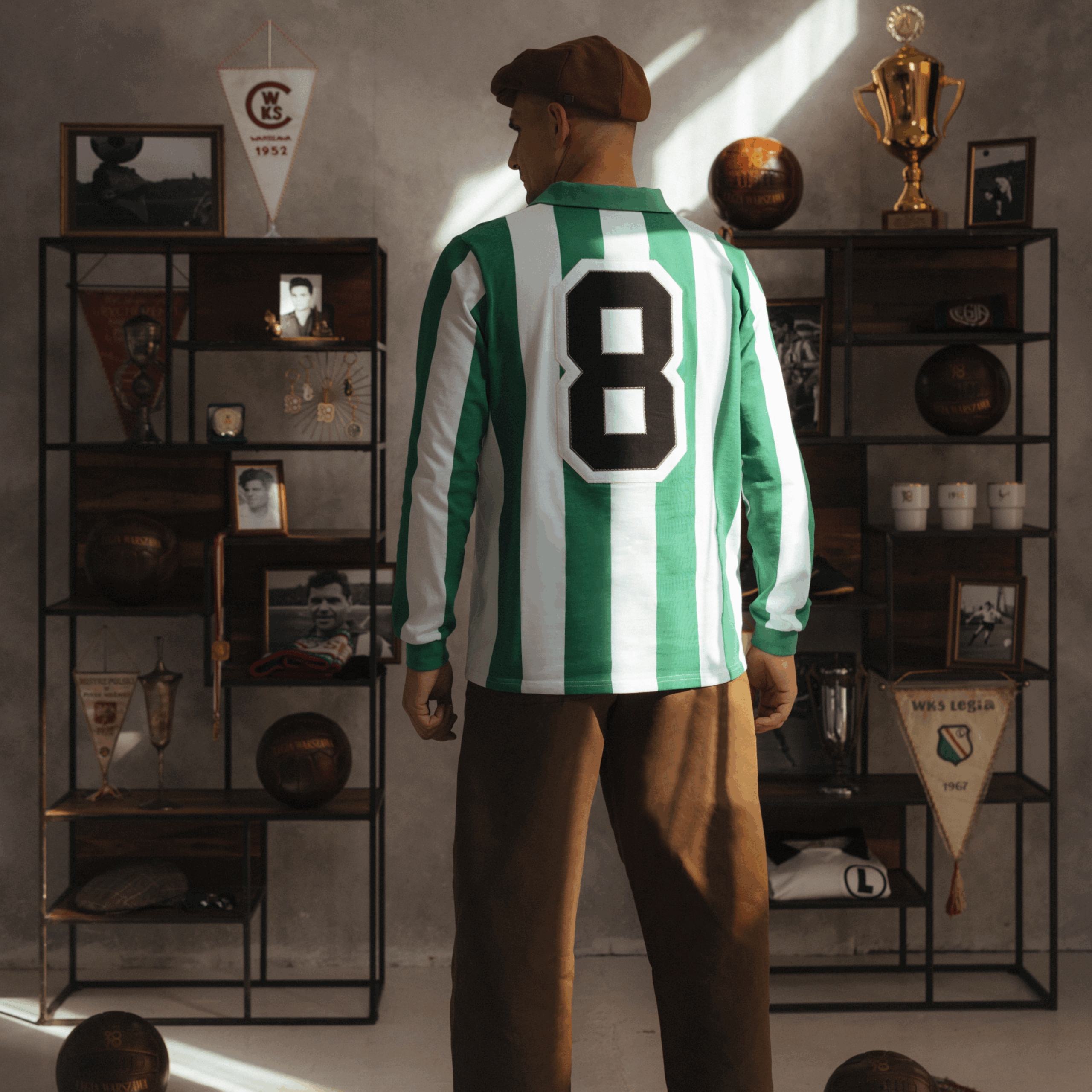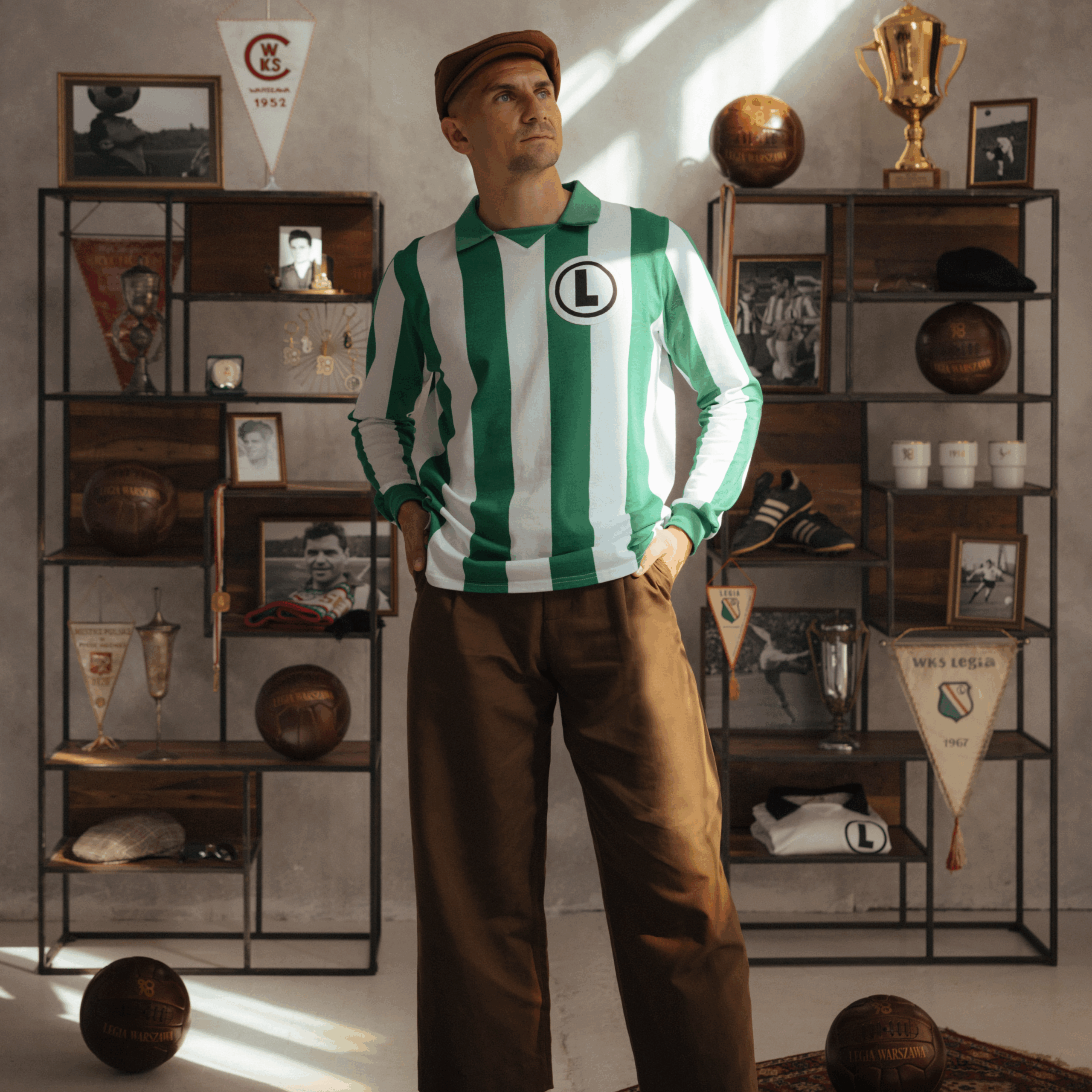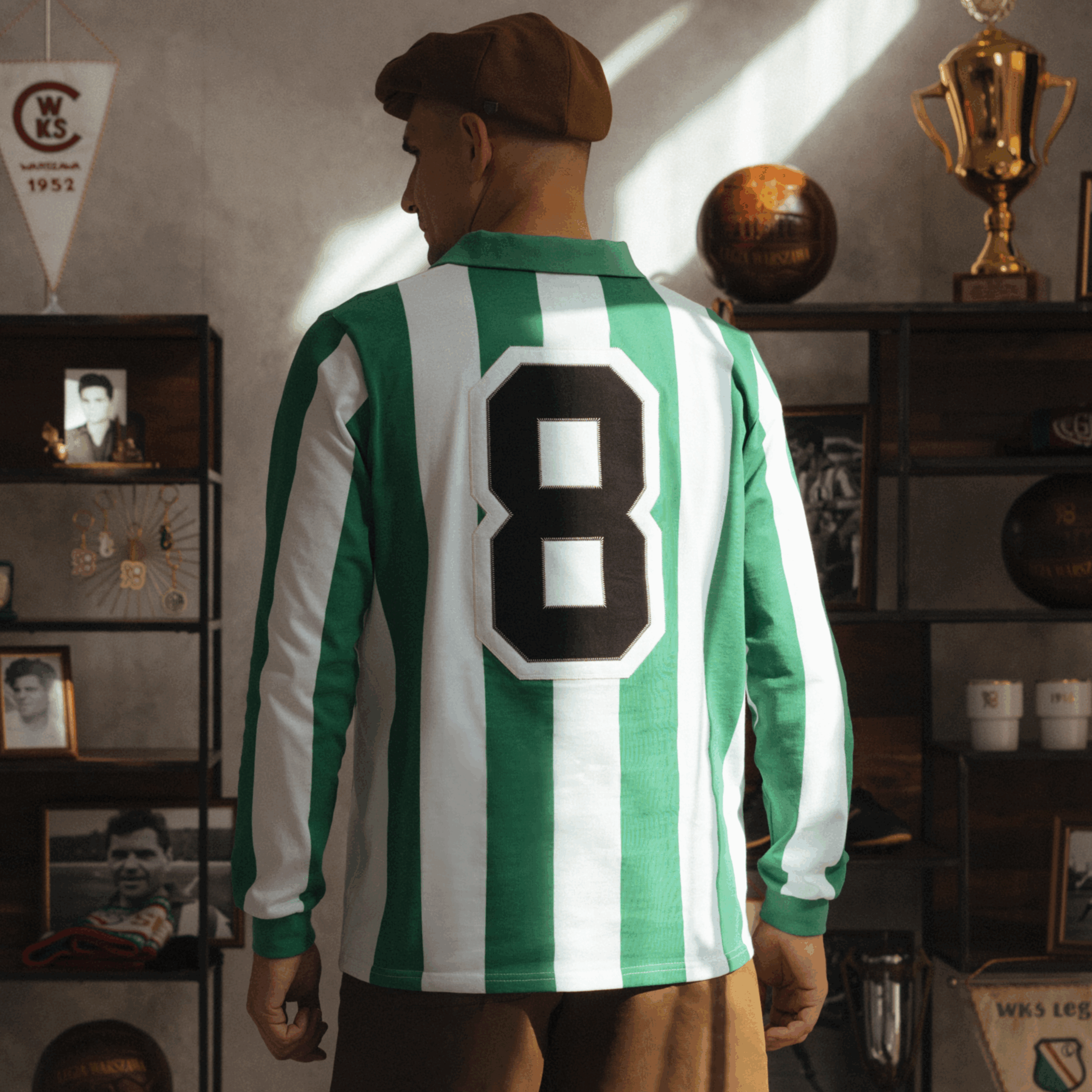 Zielono- biały pasiak wpisał się w historię legijnych trykotów i oczywiście wizerunek naszej Legendy. To właśnie w tych koszulkach Legia z Lucjanem Brychczym na czele rozegrała w 1966 na stadionie X-lecia mecz z Tottenhamem Hotspur, który uświetniał obchody 50-lecia powstania klubu. Dziś w kolekcji 90/70 90 lat Lucjana Brychczego, 70 lat z Legią Warszawa przedstawiamy reprodukcję tej koszulki. Zielono-biały longsleeve wykonany z 100% bawełnianego materiału o gramaturze 260g wykończony kołnierzykiem oraz ściągaczami na mankietach oraz dużą klasyczną eLką w czarnym kółeczku na piersi. Dzianina, której użyliśmy do stworzenia tej koszulki oraz ręcznie wycinane elementy wykorzystanie do zdobienia, jak emblemat upamiętniający jubileusz naszej Legendy, zostały wykonane w Polsce.