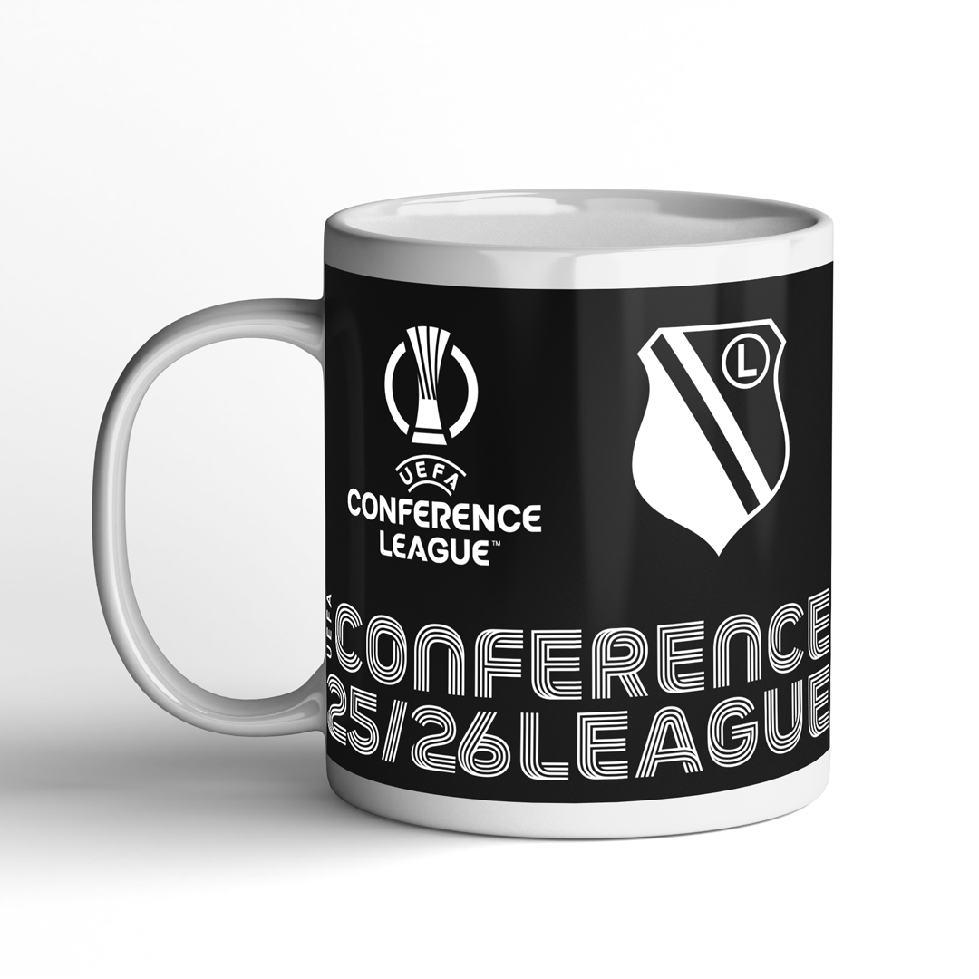 Z jednej strony herb Legii, z drugiej logo UEFA Conference League – całość na czarnym tle, które podkreśla kontrast i nowoczesny styl. Napis „Conference League 25/26” dodaje pamiątkowego charakteru, ale bez przesady – kubek wygląda dobrze także na co dzień.