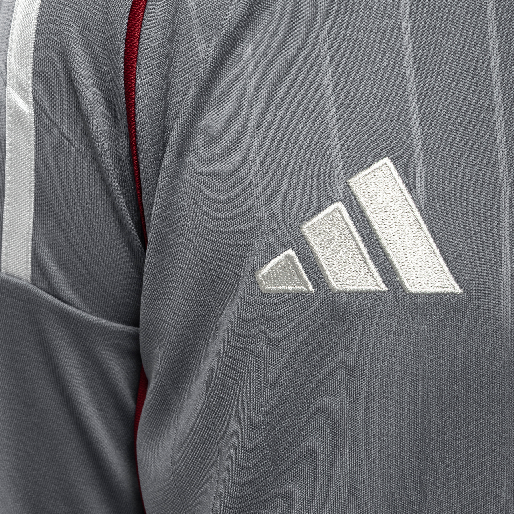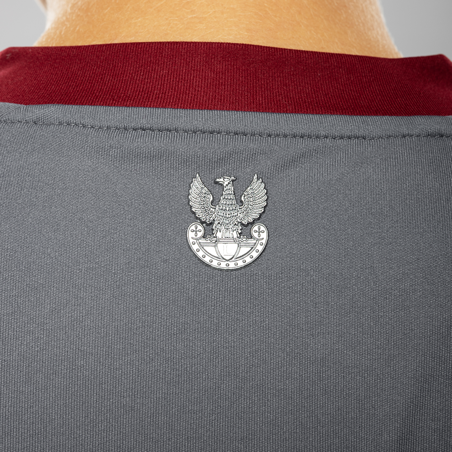Po raz pierwszy całość dominującego szarego designu koszulki uzupełniają specjalne srebrne paski i logo adidas, czarna „eLka” z szarym wypełnieniem oraz podstawowe logotypy sponsorów wykonane dedykowaną srebrną folią. Na karku znajduje się tłoczony, srebrny orzeł inspirowany wzorem historycznego Orła Legionowego, wzmacniający poczucie dumy i będący symbolem walki, także tej na boisku. Całość kompozycji zamykają subtelne bordowe wykończenia okrągłego kołnierzyka, rękawków oraz pasek konturowy na froncie, podkreślające nawiązania mundurowe.