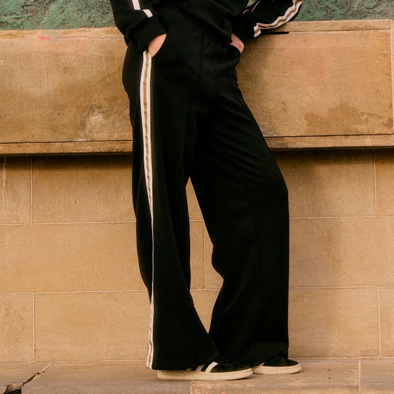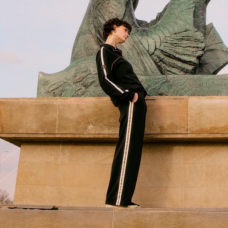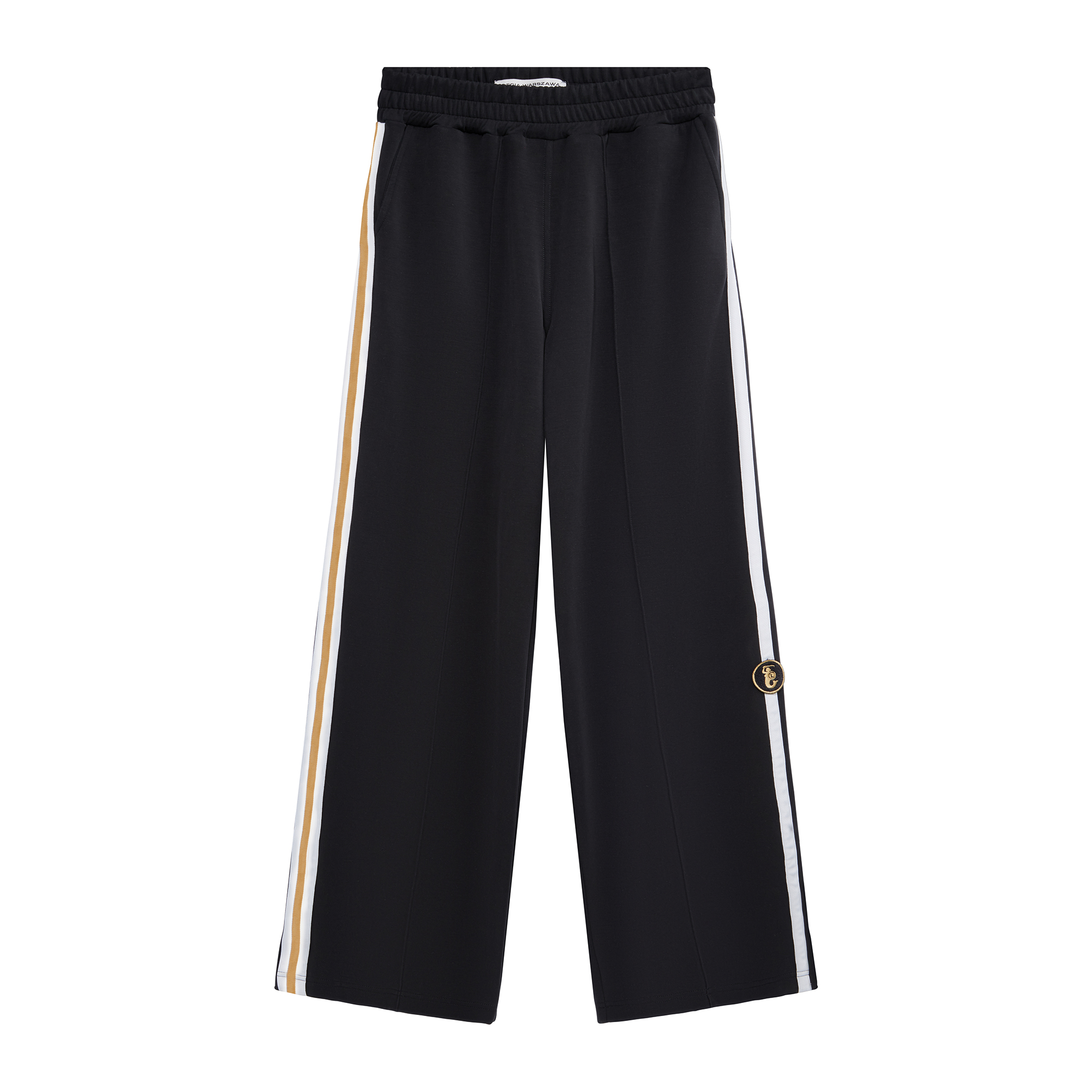 - Podwójna lamówka na prawej nogawce ze złotym pasem subtelnie podkreśla luksusowy charakter spodni.