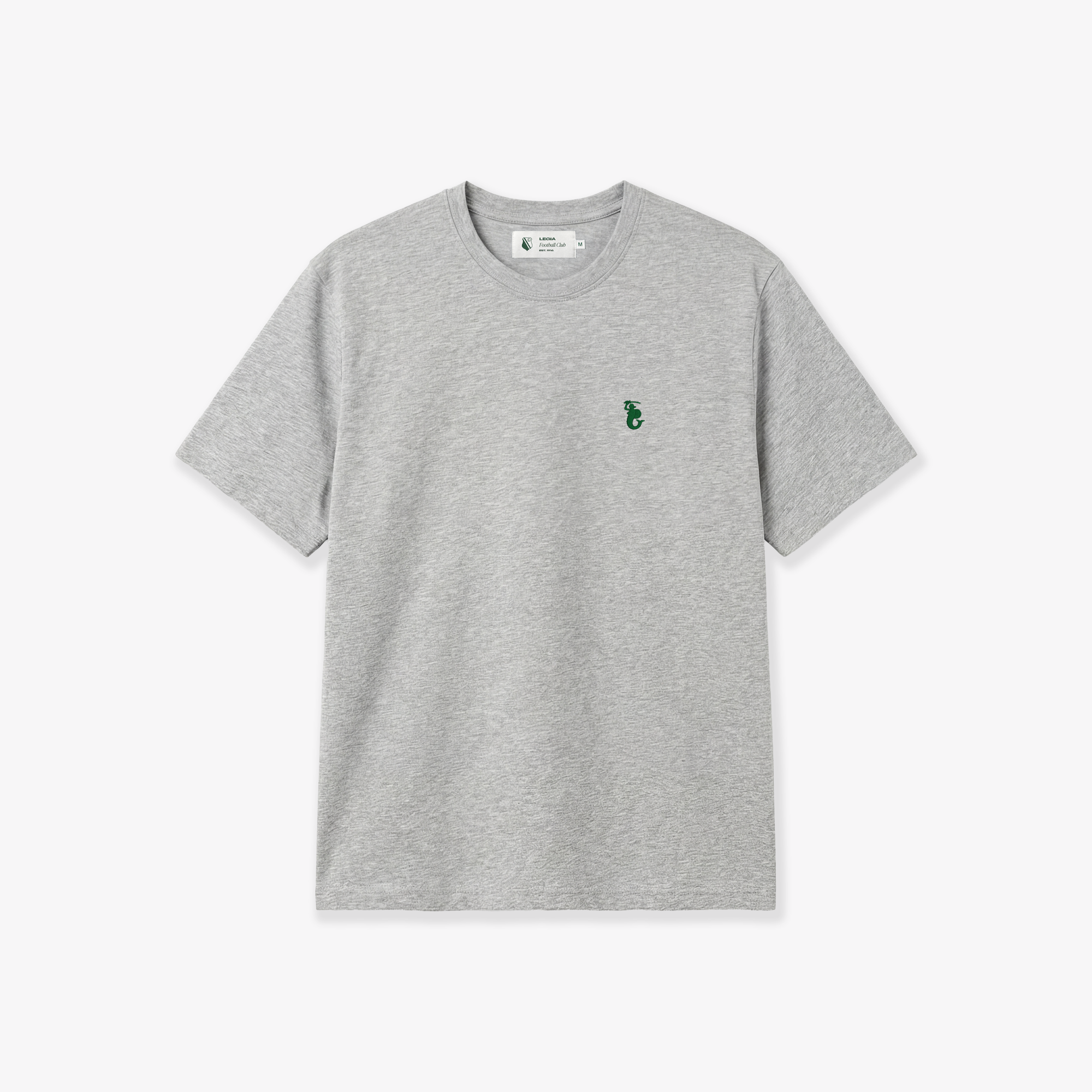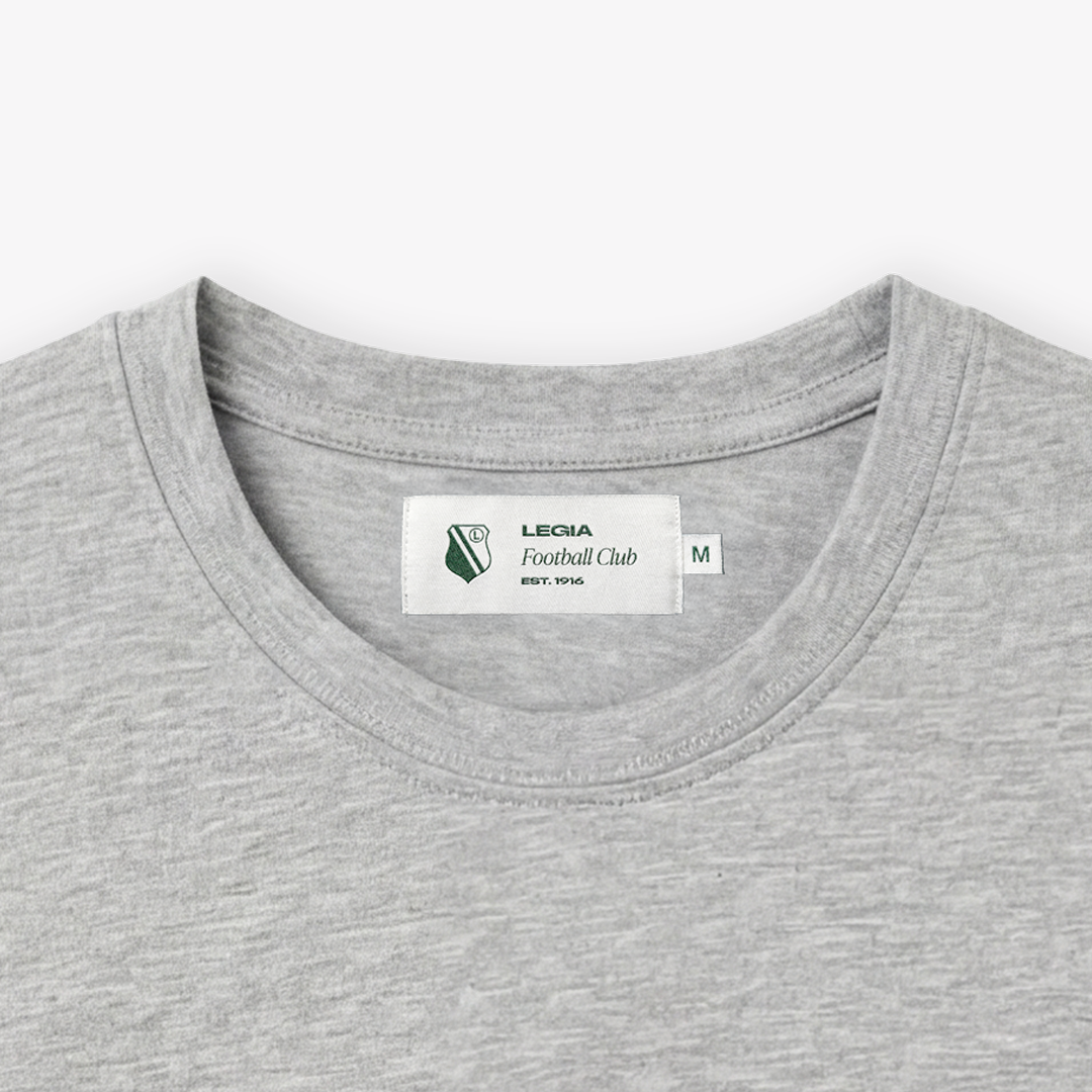 W tym modelu postawiliśmy na klasyczne połączenie barw. Na tle jasnego, melanżowego materiału wyróżnia się jeden, kluczowy detal: zielony haft Syrenki Warszawskiej na lewej piersi. Ten kontrast jest wyraźny, ale nie krzykliwy. Dzięki temu koszulka wygląda świeżo i nowocześnie, jednocześnie jasno komunikując Twoje przywiązanie do barw Legii. Reszta pozostaje czysta – bez zbędnych napisów na plecach czy rękawach.