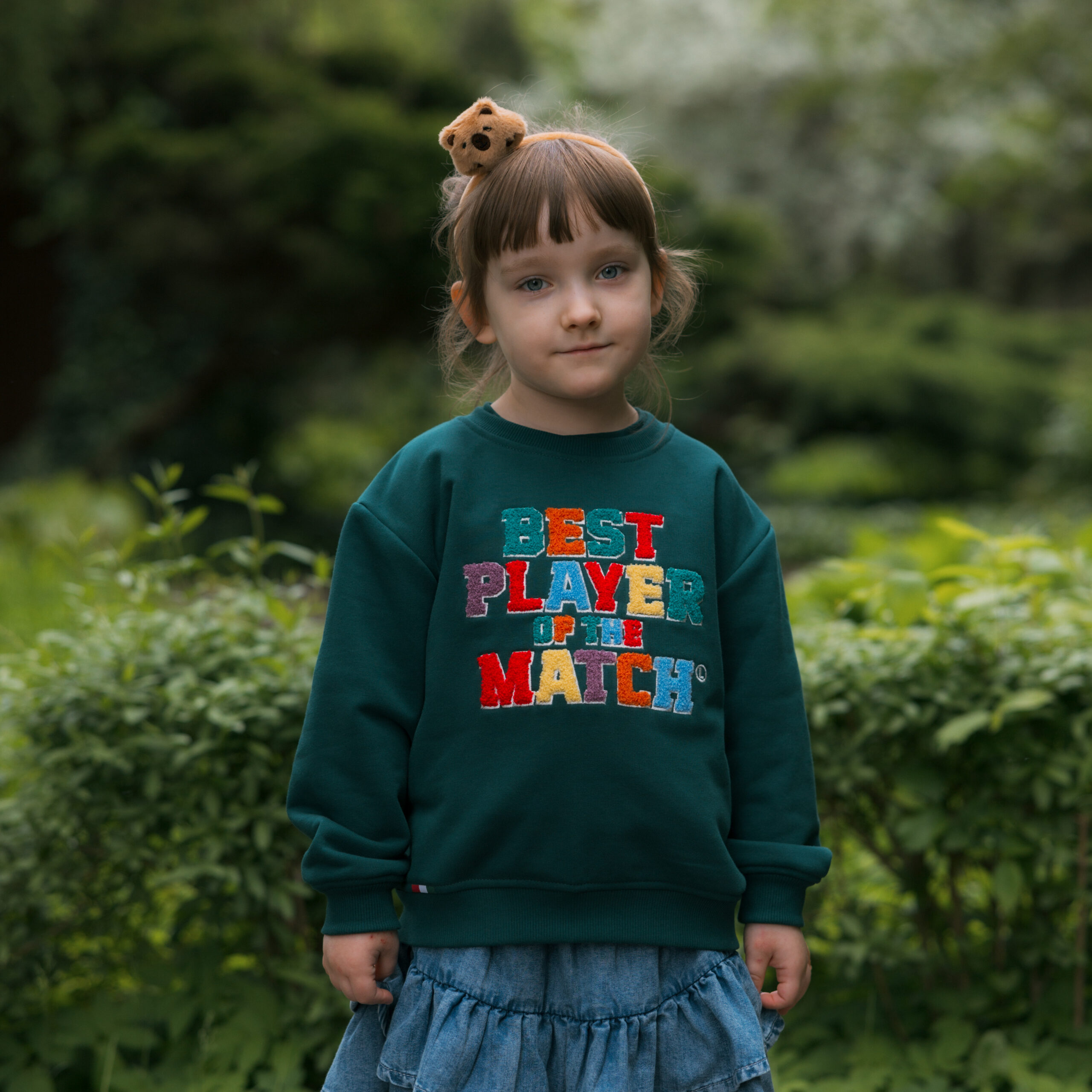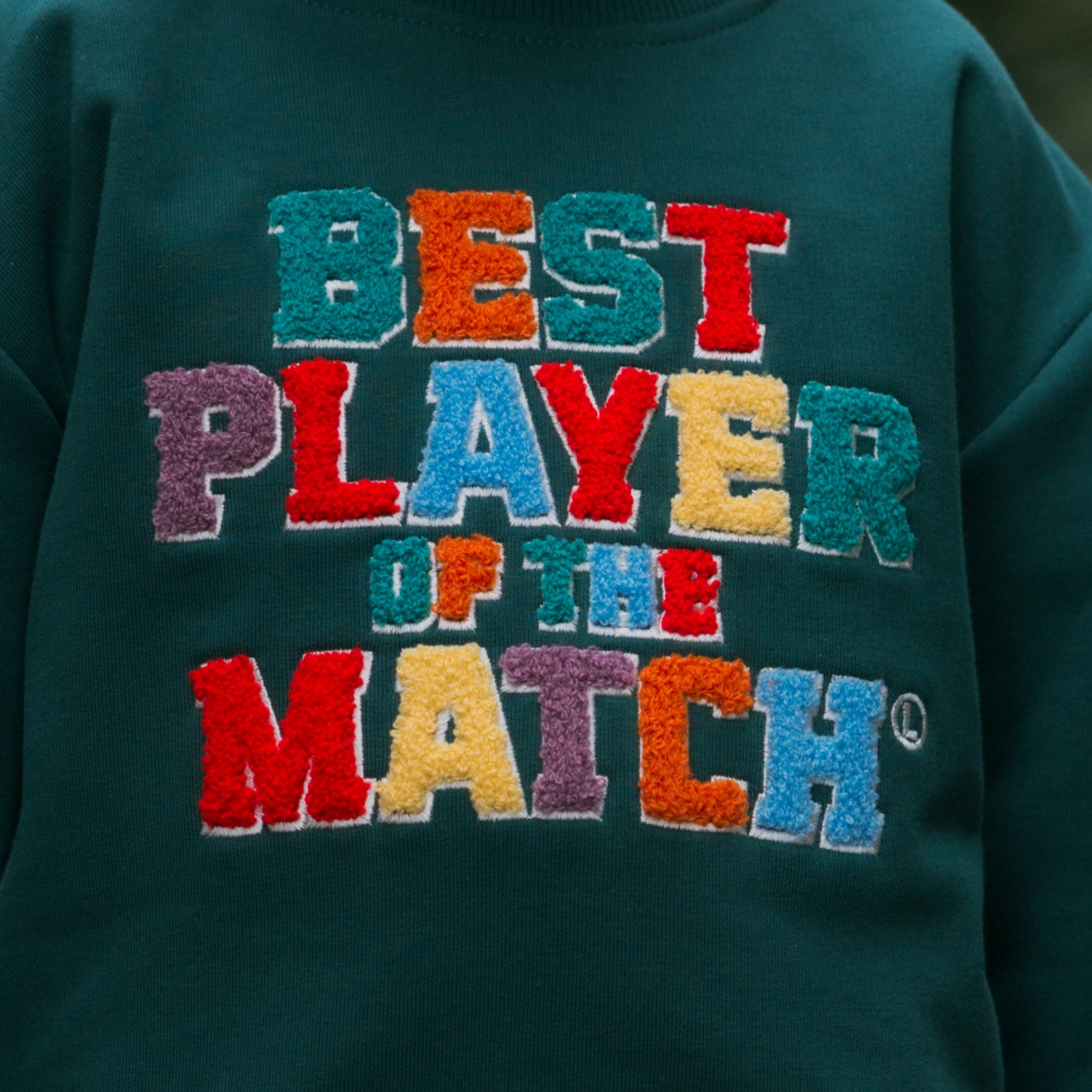 Ta bluza to codzienna dawka energii i uśmiechu. Głęboka zieleń łączy się z radosnym napisem „BEST PLAYER OF THE MATCH” w pełnej gamie kolorów, tworząc projekt, który przyciąga wzrok i budzi pozytywne emocje. Każda litera jest inna, a to daje poczucie lekkości i dziecięcej swobody.